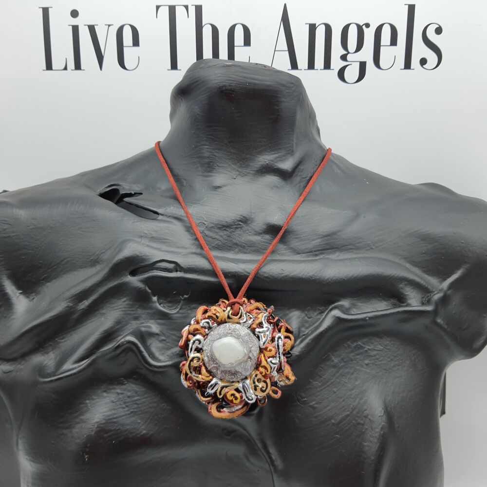 Collana Arte realizzata con laccio in daino sintetico e centrale composto da colla a caldo ,pietra naturale e smalto.