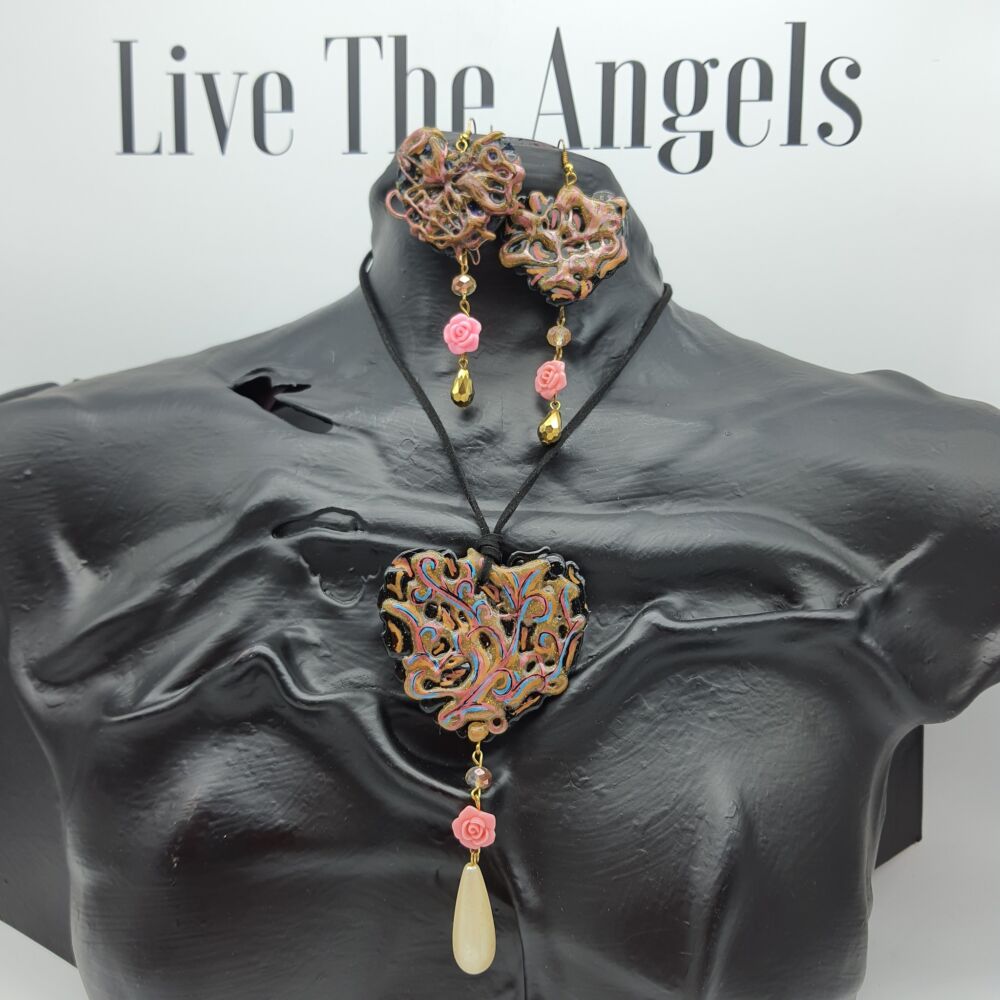 Cuori composti da colla a caldo , smalto , connettori e pendenti in acrilico e cristalli