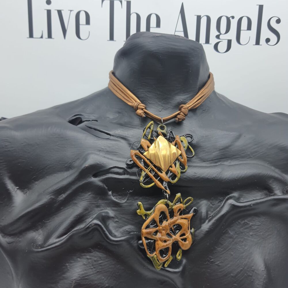 Collana Arte realizzata con laccio in maglia elastica bronzo e centrale composto da colla a caldo , ottone e smalto.