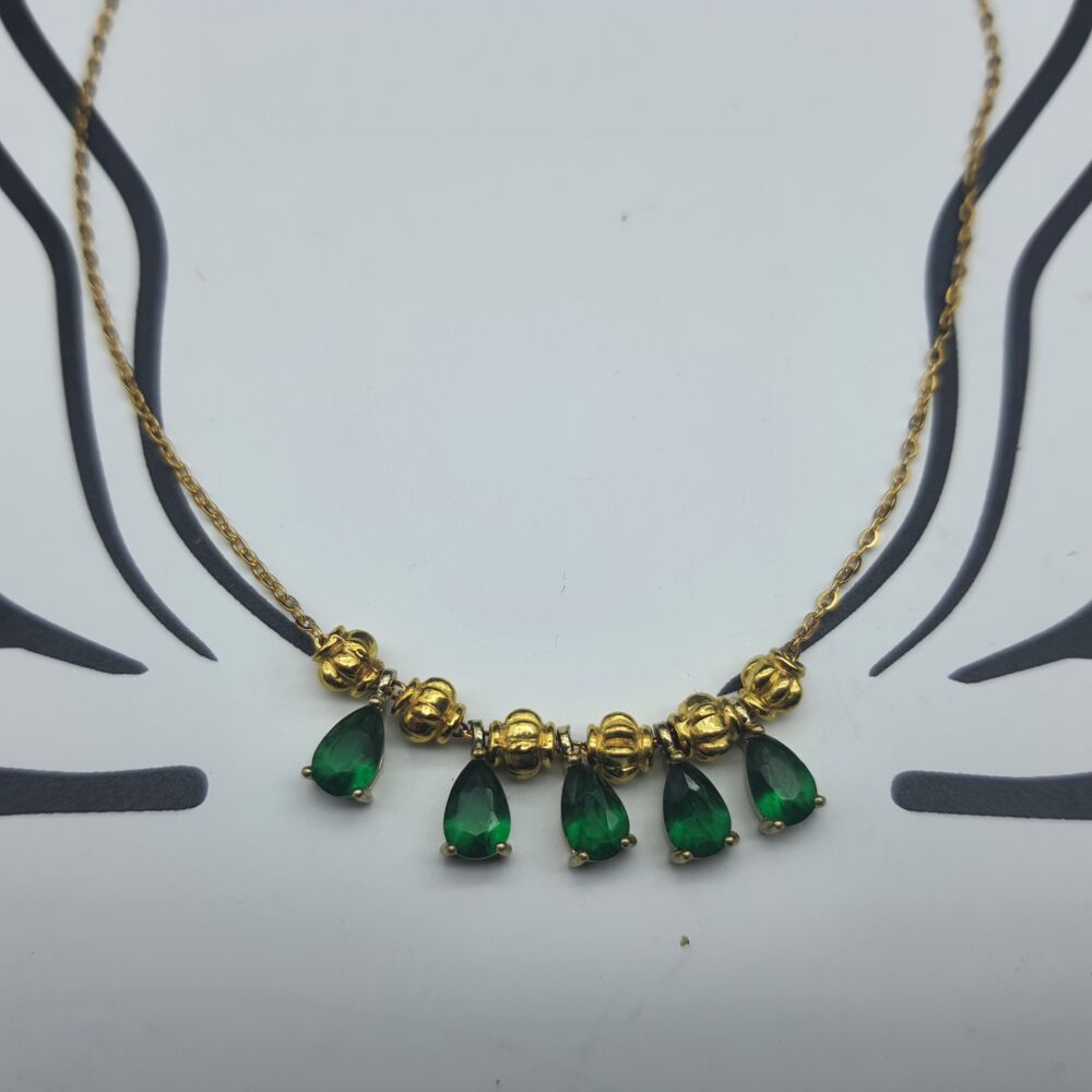 Collana girocollo minimal style realizzata con catenine in acciaio ed elementi in ottone placcato e gocce in cristallo verde