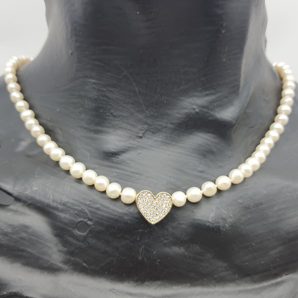 Collana girocollo realizzata con perle di fiume 4 mm. elaborata con nodini e bellissimo centrale cuore in ottone e micro pavè