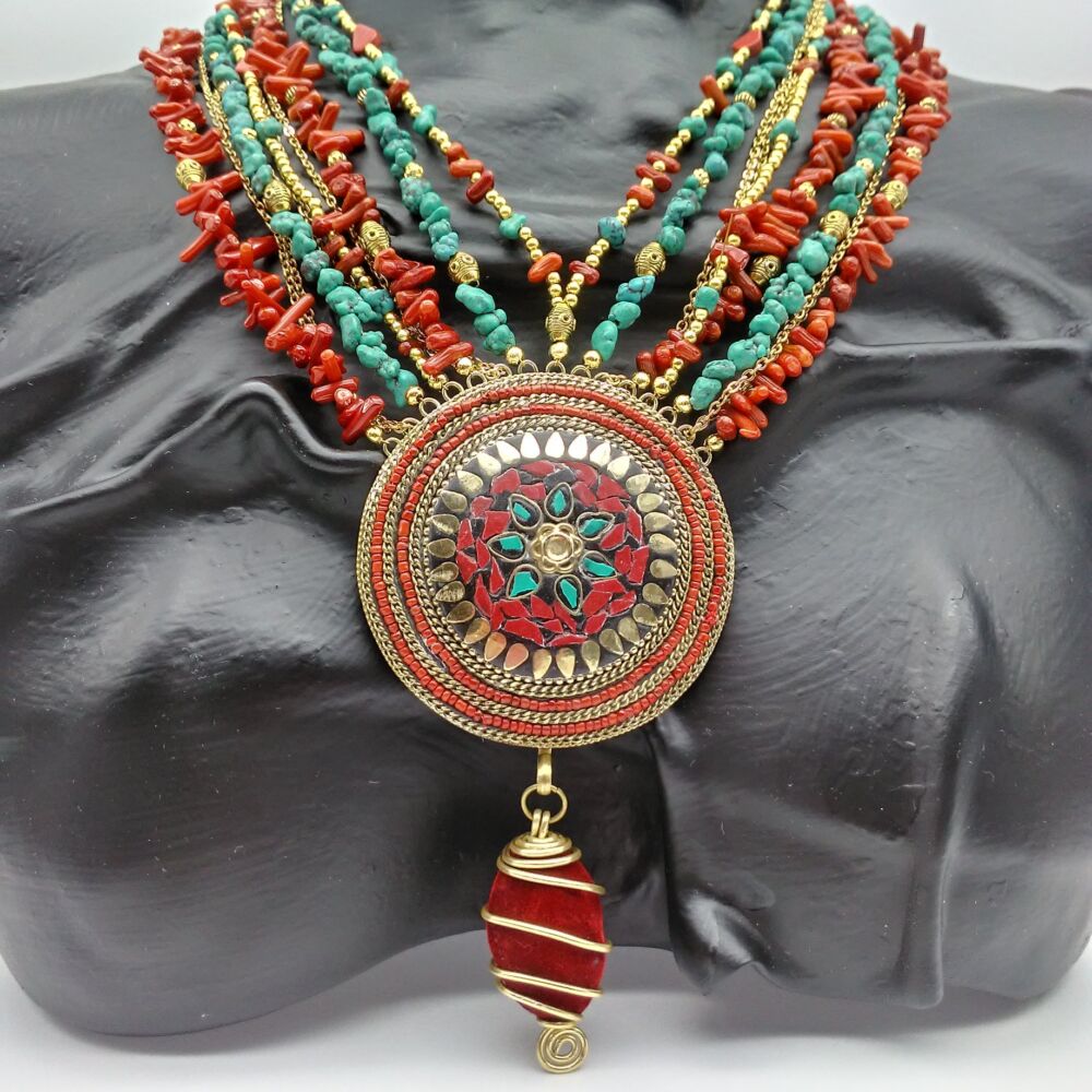 Collana multi fili realizzata con elementi e filo in ottone , pietre dure di corallo bambù e howlite.