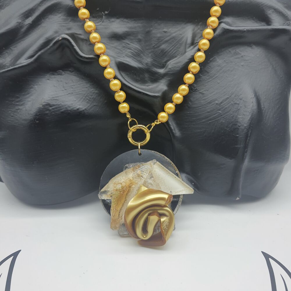 Collana arte elaborata con perle dorate e centrale in plexiglass nero con rosa color oro realizzato a mano