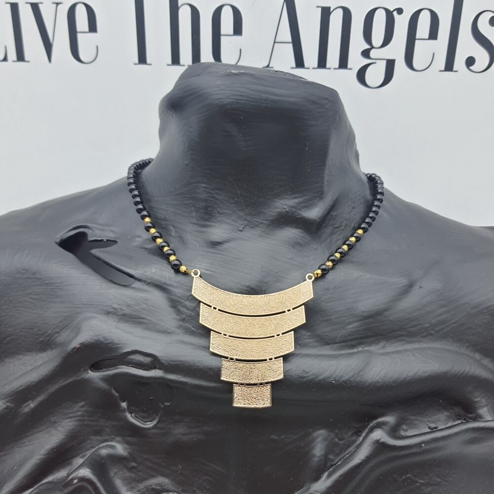 Collana girocollo realizzata con sfere in onice e centrale di stile etnico elaborato in ottone .
