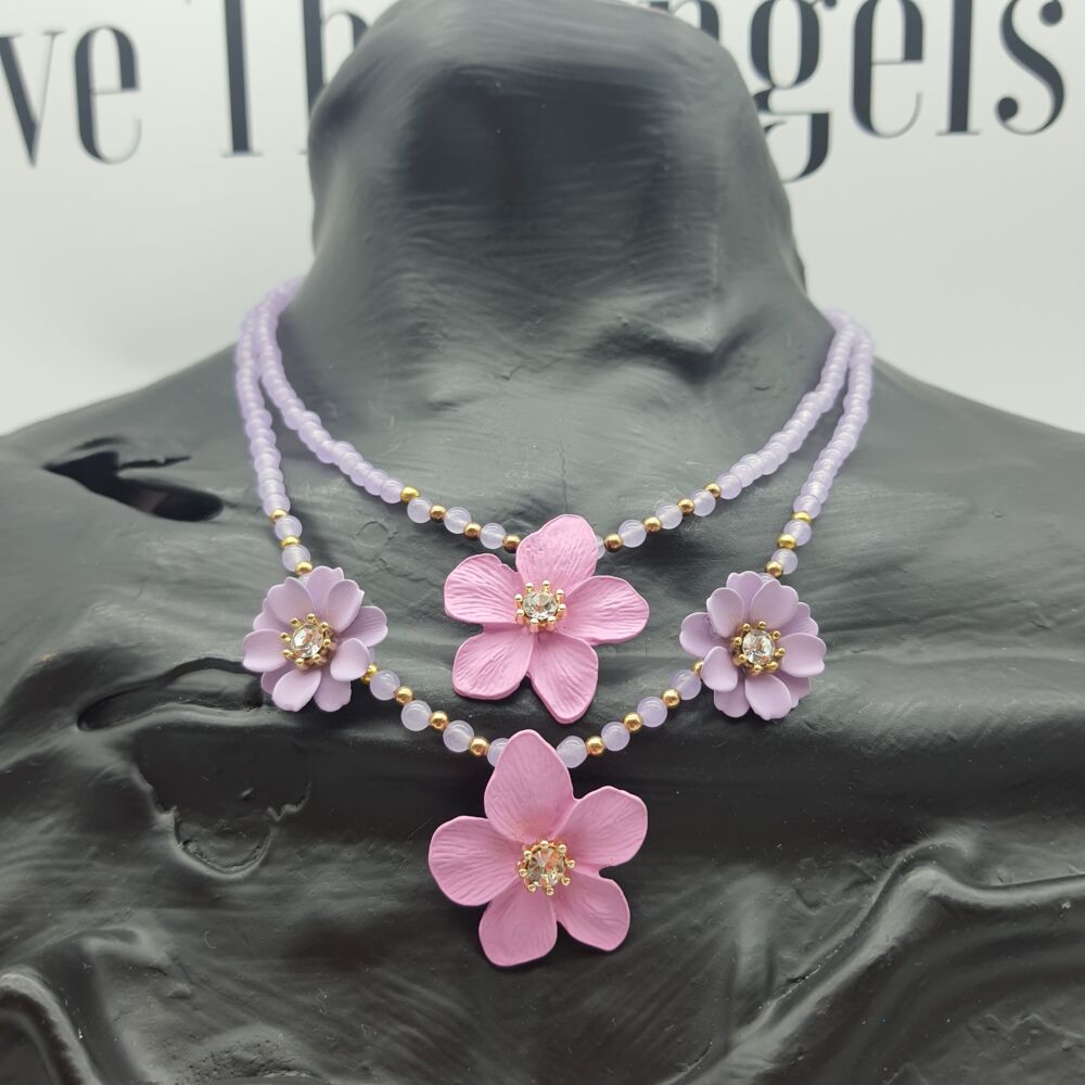 Collana girocollo realizzata con pietre dure di agata viola ,connettori in ottone e fiori smaltati.