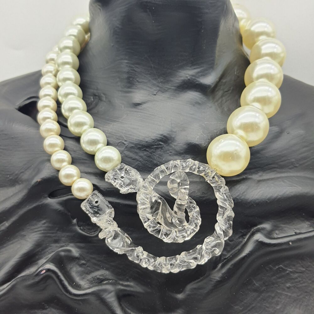 Collana girocollo, realizzata con perle acriliche di grandi dimensioni da mm. 15 a 25 mm., con importante centrale in plexiglass realizzato a mano.