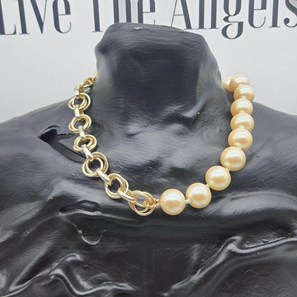 Collana girocollo realizzata per metà con catena dorata in alluminio e bellissime perle color avorio in resina.
